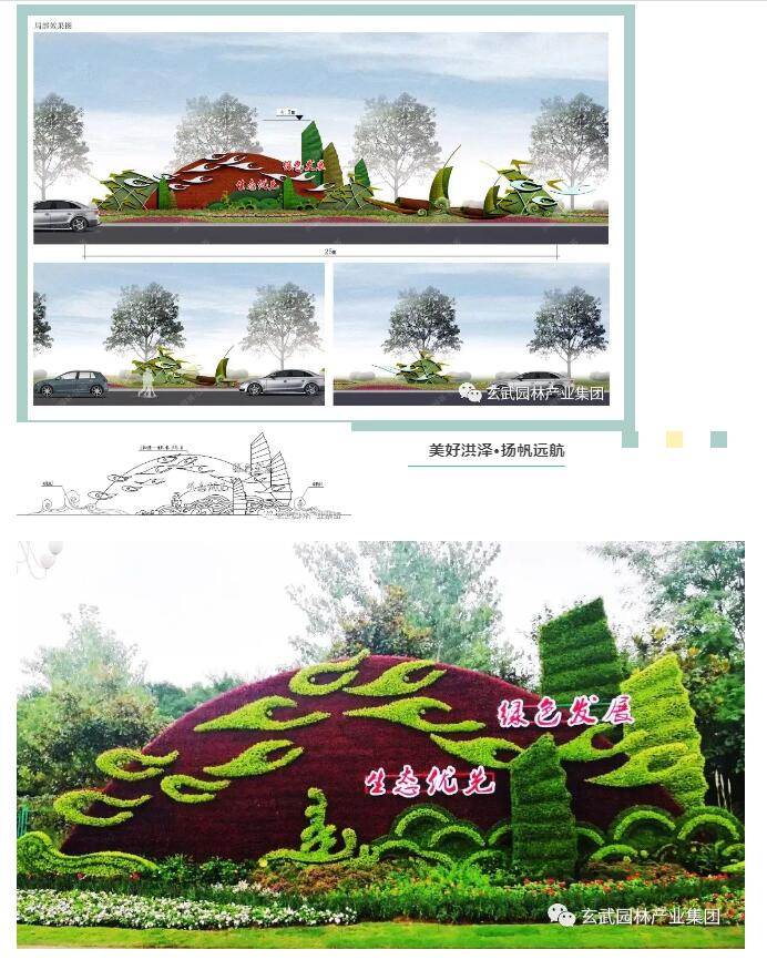 整體綠雕設計具有濃郁的水鄉(xiāng)文化特色,初升的旭日給洪澤帶來了晨曦,翱翔的鷺鳥展現著城市的魅力,在四方友人的美好希冀下,洪澤將更蓬勃發(fā)展、生機盎然。