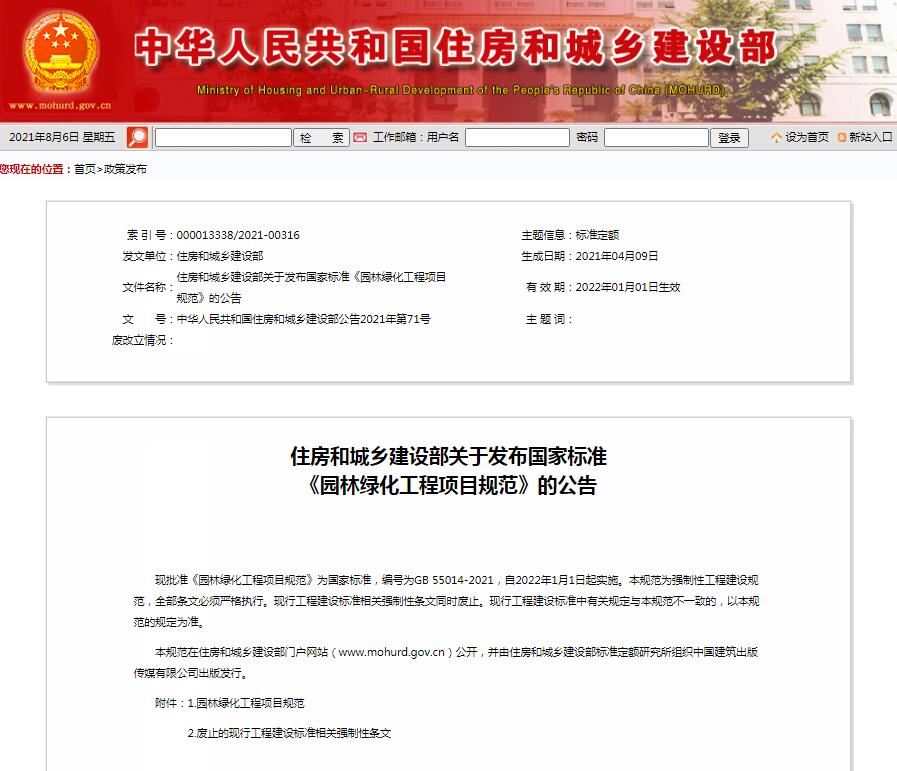 日前,住建部發(fā)布公告,批準(zhǔn)《園林綠化工程項(xiàng)目規(guī)范》為國家標(biāo)準(zhǔn),編號為GB 55014-2021,自2022年1月1日起實(shí)施。